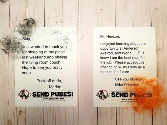 - "Thinking of you, dry your tears on these pubes." Sincerely, Fuck Off